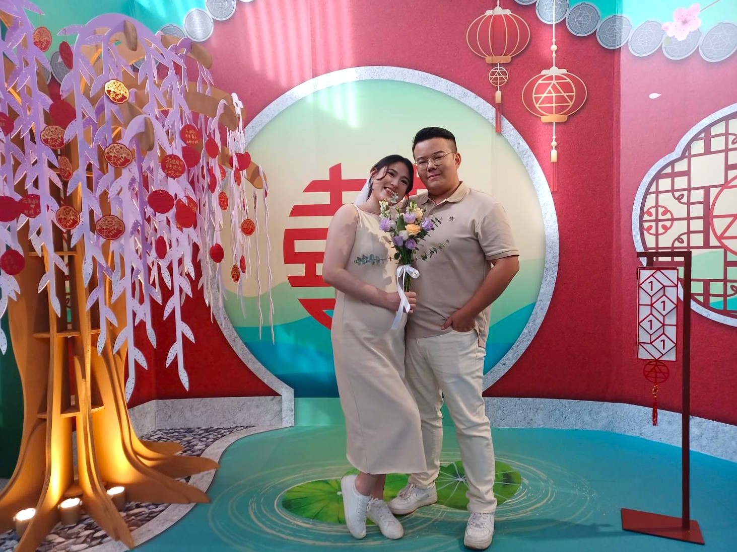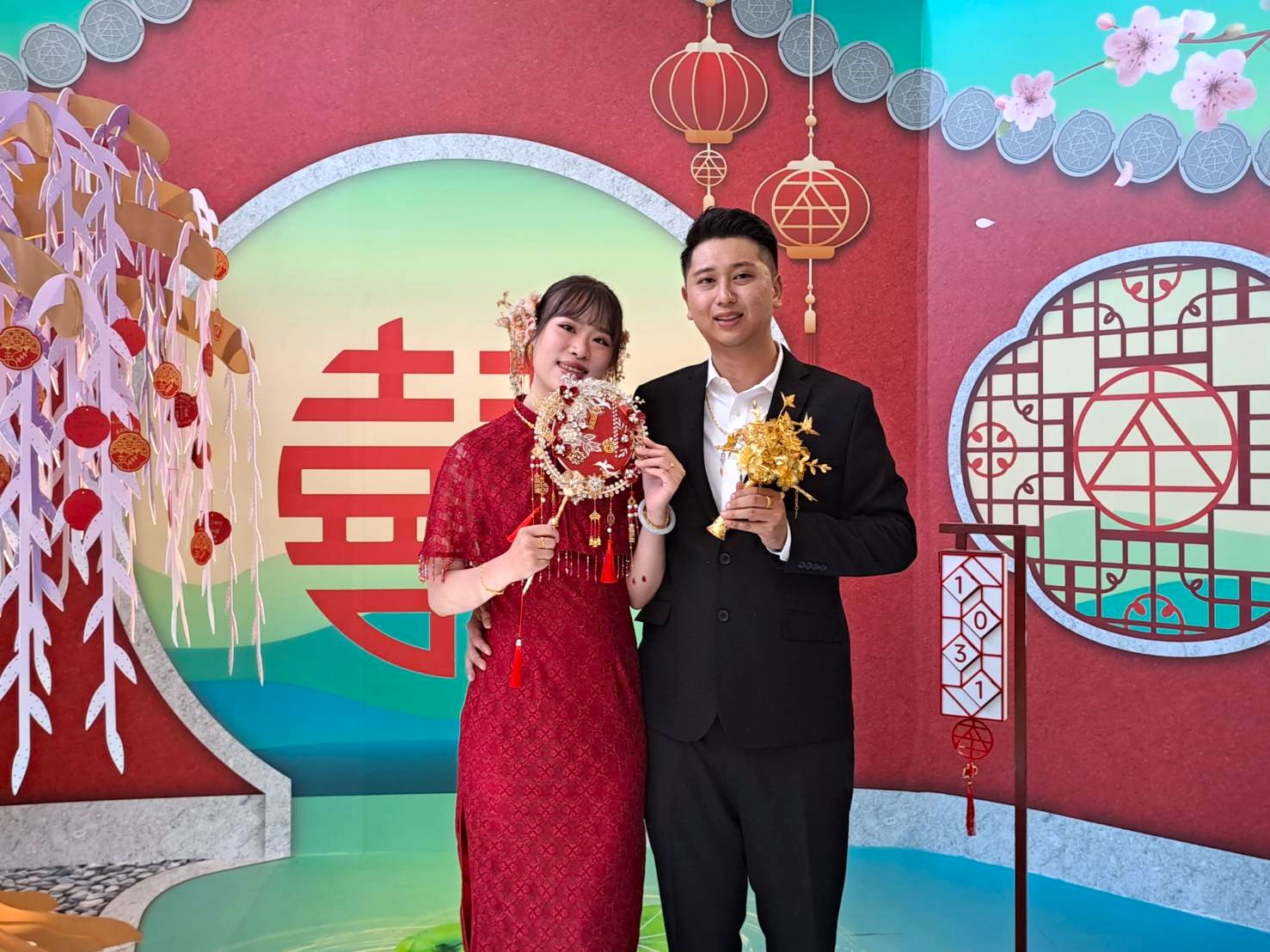 結婚牆以「幸福長久、吉慶相隨」為設計主軸,整體融合古典意象與現代美感,象徵婚姻圓滿與愛情長久。牆面中央以大紅「囍」字為主視覺,展現喜慶氛圍;牆面窗花巧飾「太平」二字,搭配太平燈籠,寓意幸福安康、家庭和樂。夢幻愛情樹上設有「幸福小卡」懸掛區,讓新人與親友寫下祝福心語,留下美好回憶。綻放的桃花象徵甜蜜愛情,地面雙荷葉寓意永結同心,整體設計傳遞出溫馨浪漫與戶政服務的人文關懷。
