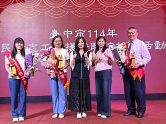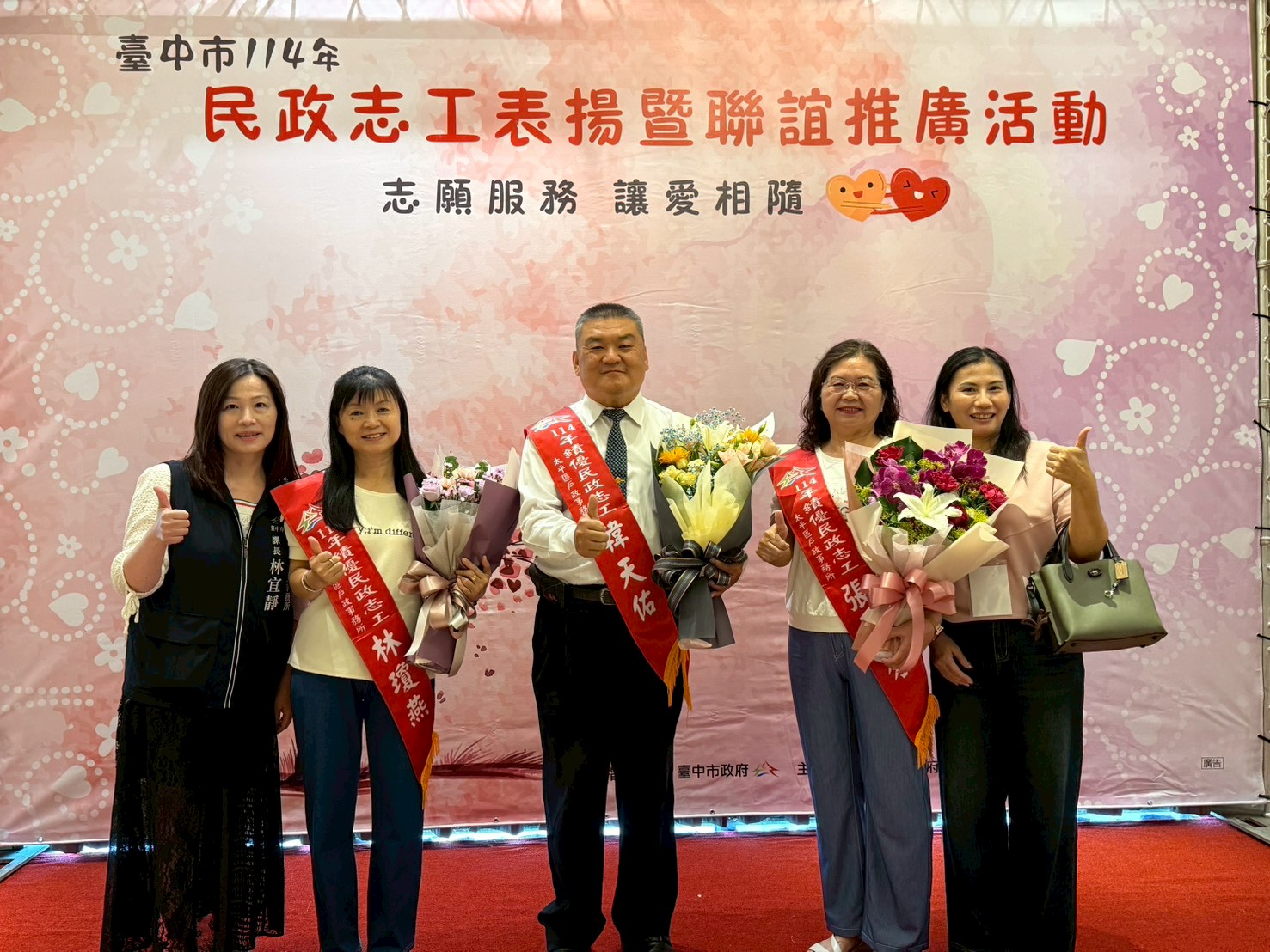 114年民政績優志工表揚_局長頒獎 今(31)日於潮港城歡喜登場,現場笑聲、掌聲與感動不斷綻放! 恭喜本所志工之星 : 瓊燕姐、麗芬姐、天佑大哥 榮獲「績優民政志工」殊榮,由民政局吳局長親自頒獎 .ᐟ 感謝三位平日熱心服務、親切引導,讓服務現場多一份笑容、多一分溫度,因為有你們,讓臺中更幸福、更美好!