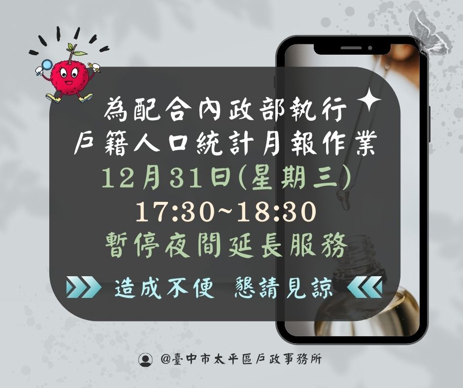 本市各戶政事務所12月31日(星期三)暫停夜間延長服務公告